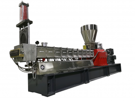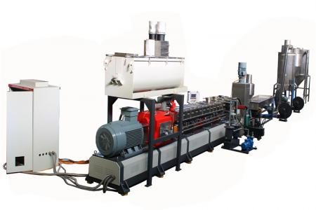 在加熱和混合的作用下,材料在擠出腔內(nèi)形成高壓狀態(tài),并通過模具的作用,將材料擠出成型,形成顆粒產(chǎn)品。主要組成部分包括驅(qū)動系統(tǒng)、傳動系統(tǒng)、加料系統(tǒng)、加熱冷卻系統(tǒng)、真空排氣系統(tǒng)、切粒系統(tǒng)等。